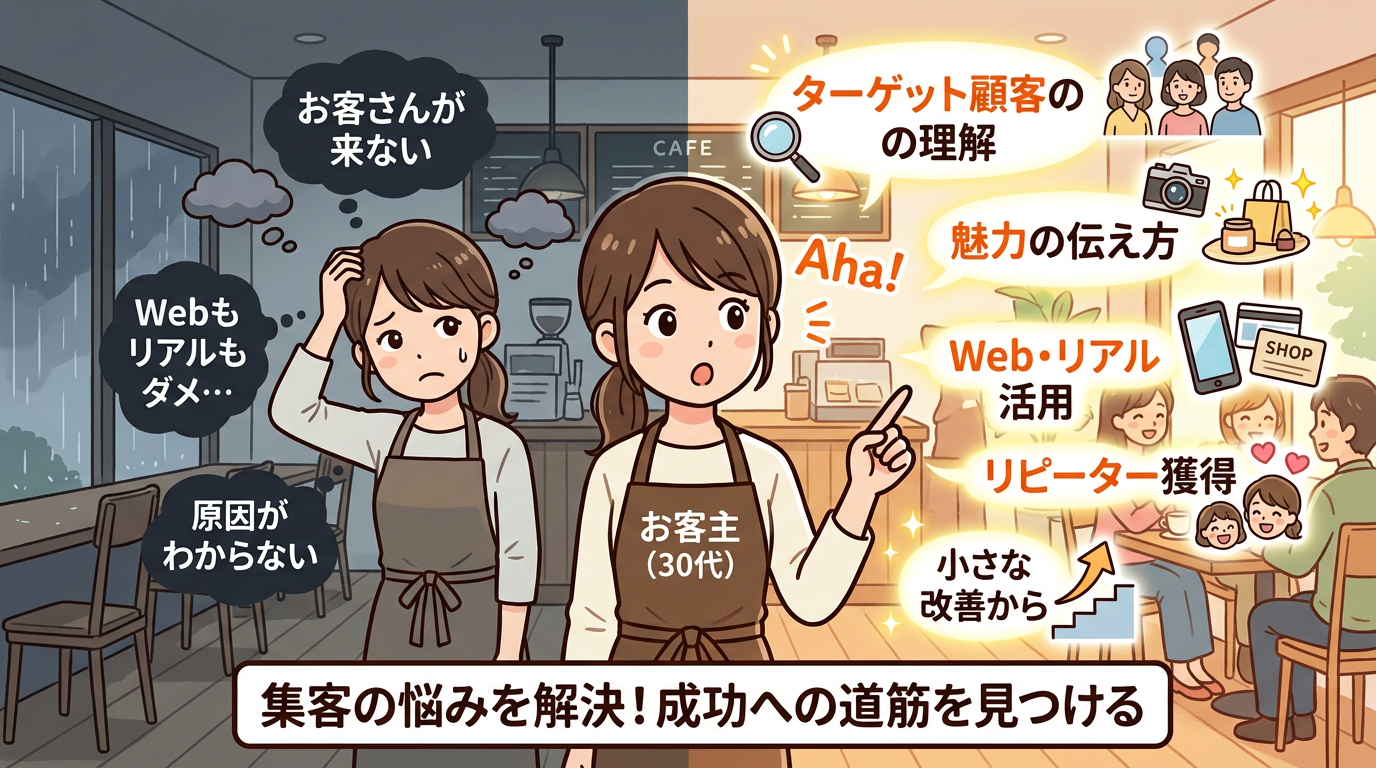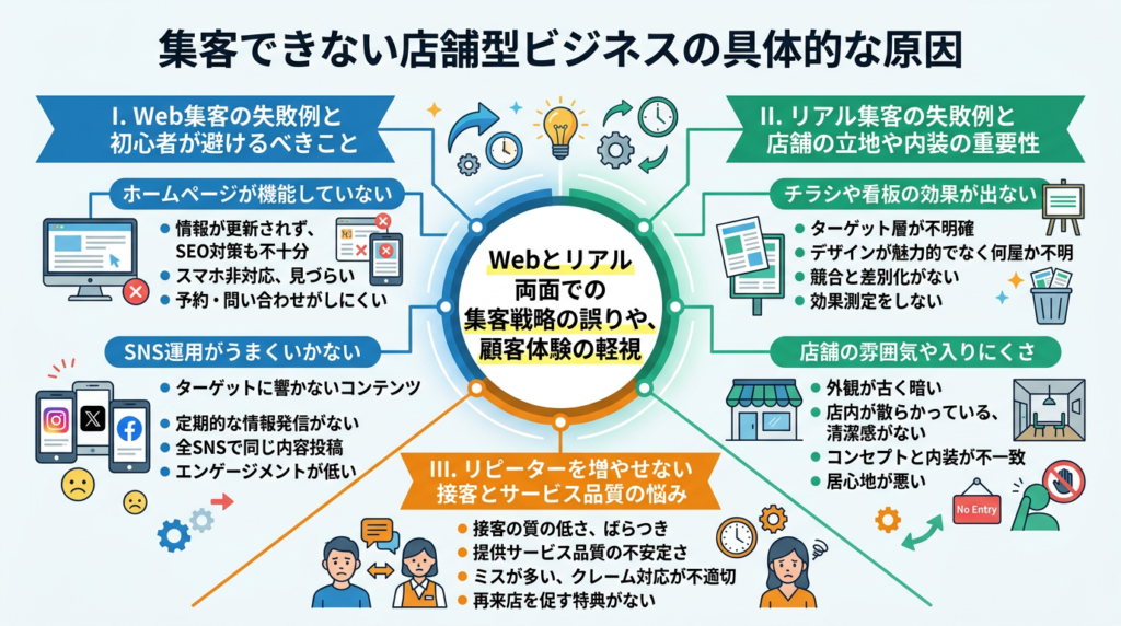「なぜお店にお客さんが来ない?」「Webもリアルも集客がうまくいかない…」店舗型ビジネスの超初心者で、集客の失敗や悩みに直面していませんか?この記事では、多くの店舗オーナーが陥りがちな失敗パターンや、集客がうまくいかない具体的な原因を徹底解説。ターゲット顧客の理解不足、魅力の伝え方、Web・リアル集客の落とし穴、リピーター獲得の壁など、あなたの店舗が抱える悩みの本質を明らかにします。失敗の原因を理解し、小さな改善から集客力を高める第一歩を踏み出すヒントが満載です。この記事を読めば、集客の悩みを解決し、成功への道筋が見つかるでしょう。
